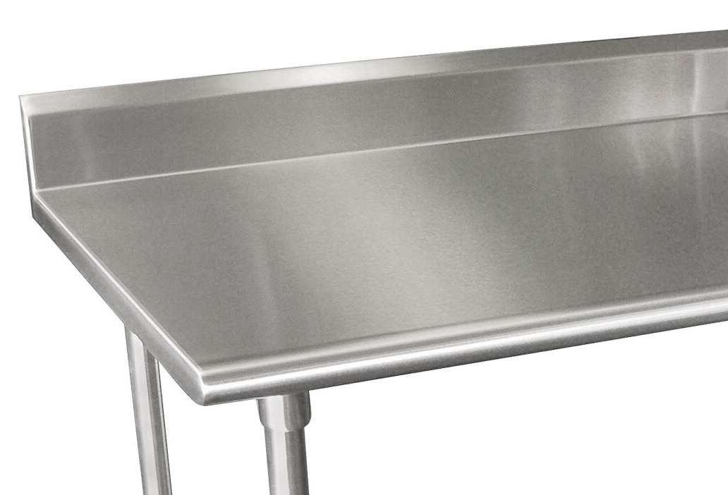 This work table's top shelf is made of 16 gauge type 304 stainless steel for long-lasting, dependable service life. It features an easy-to-clean rolled front, and the sides of the table are squared off for flush placement against walls or other tables. It also features a sound-deadened top to help keep loud noises from disturbing your customers. A 5" backsplash prevents items from falling behind the table, while also protecting your walls from splashes for more sanitary conditions. Plus, the top shelf boasts a weight capacity of approximately 450 lb.