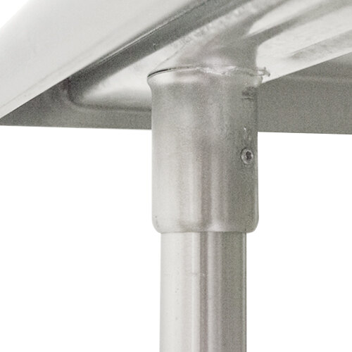 This work table's top shelf is made of 16 gauge type 304 stainless steel for long-lasting, dependable service life. It features an easy-to-clean rolled front, and the sides of the table are squared off for flush placement against walls or other tables. It also features a sound-deadened top to help keep loud noises from disturbing your customers. A 5" backsplash prevents items from falling behind the table, while also protecting your walls from splashes for more sanitary conditions. Plus, the top shelf boasts a weight capacity of approximately 450 lb.