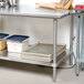 This 24" x 120" work table's adjustable 18 gauge undershelf is secured by a die cast leg clamp for superior support without the hassle of nuts and bolts. To ensure stability, each work table comes with stainless steel 1 5/8" diameter legs and matching, adjustable bullet feet. It can support up to 400 lb. of evenly distributed weight.