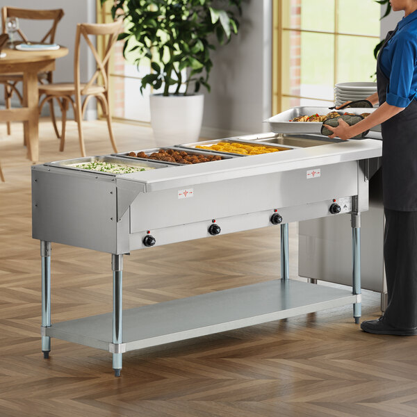 This Advance Tabco electric food table features four sealed wells that keep your food products at proper temperatures so you can adhere to HACCP food temperature guidelines. It's designed to hold food pans (sold separately) full of pasta, meat, or side dishes. Plus, the indicator lights and control knobs are recessed to help prevent clogging and breakage from spilled food and dropped pans. It requires a 120V electrical connection.