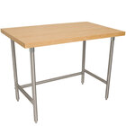 The Advance Tabco TH2S-245 wood top work table features a heavy duty, 18 gauge stainless steel open base for added storage space, and stainless steel 1 5/8" diameter legs, with 1" adjustable feet for precise leveling.