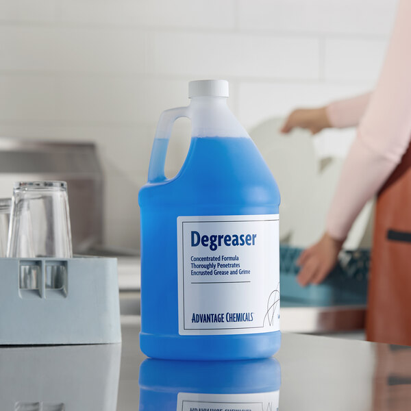 Safe for use on stainless steel and aluminum surfaces, Advantage Chemicals degreaser removes grease and food from stoves, grills, refrigerators, fryers, and just about any other piece of food service equipment. Its bright blue color makes it easily identifiable to your employees, and the bottle's large handle makes it comfortable to use.