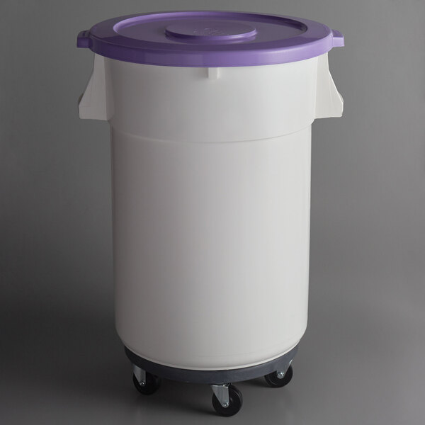 Reduce the risk of cross-contact and cross-contamination with this Baker's Mark allergen-free 44 gallon white round ingredient bin with purple lid and gray dolly!