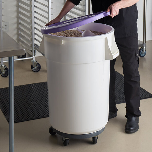Quickly identify allergen-free ingredients in your commercial kitchen with this bin, lid, and dolly combo. The bin's heavy-duty plastic resin material is ready for dry storage of gluten-free, soy-free, or dairy-free flours, baking mixes, grains, and other ingredients. The purple lid distinguishes the bin's contents as allergen-free, keeping kitchen staff in the loop and providing a tight seal to protect against airborne and other contaminants. This mobile ingredient storage bin kit is a necessary addition to your restaurant's back-of-house operations.
