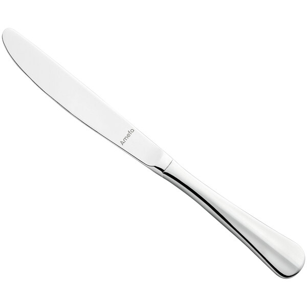 Create a versatile and attractive table setting with this Amefa Baguette 8 5/16" 18/10 stainless steel extra heavy weight dessert knife. The Baguette line features an elegant, teardrop baguette handle and adds a timeless touch to your tabletop display. This flatware is designed to resist corrosion and maintain brilliance over repeated industrial wash cycles. Its polished finish offers a smooth, professional appearance, yet doesn't take the focus away from your perfectly-plated culinary creations.