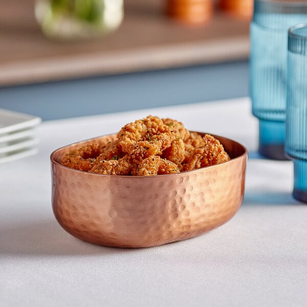 Use this 25 oz. bowl to serve anything from personal and shareable appetizers to salads or plentiful sides. Whatever you choose to serve, the look and feel of this American Metalcraft bowl is sure to create an enticing culinary display. Moreover, its subtly reflective aluminum surface will capture your dining area lighting just right, setting the tone for a dining experience to remember. This bowl's lustrous copper finish will pair ideally with diverse cultural cuisine and take your patrons on a trip back in time.