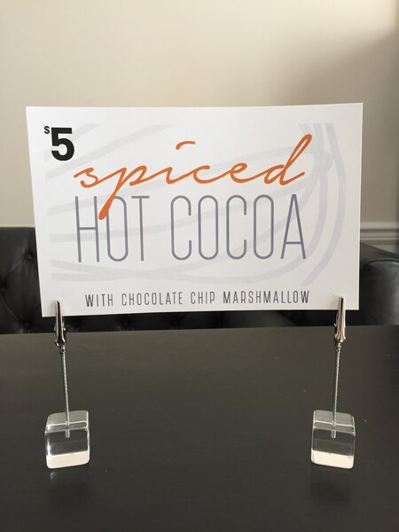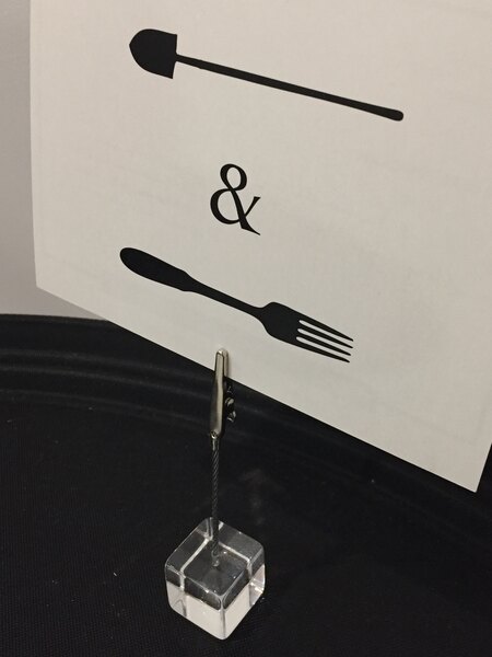 Another type of card holder we own are these alligator clip style holders. This product allows you to clip on a piece of paper with a menu or drink item and place on a buffet table or serving station. The base is acrylic and clip is aluminum color. Great for causal events such as luncheons or meeting buffets.