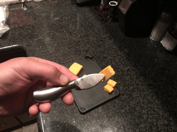 I use this American Metalcraft Evolution five and one-quarter inch stainless steel semi-hard cheese knife on a regular basis, even with dense condiments like cold butter. We recently started expanding our sandwich recipes and this tool has been invaluable with any cheese-cutting need. I would highly recommend.