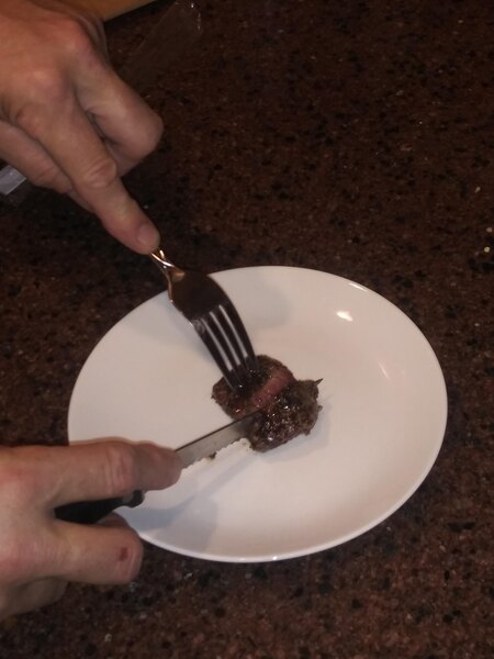 This is a mid range steak knife. It has a larger number of serrations that help cut through meat easier. These still leave some of a steak that is cooked medium rare with some shredded meat visible.