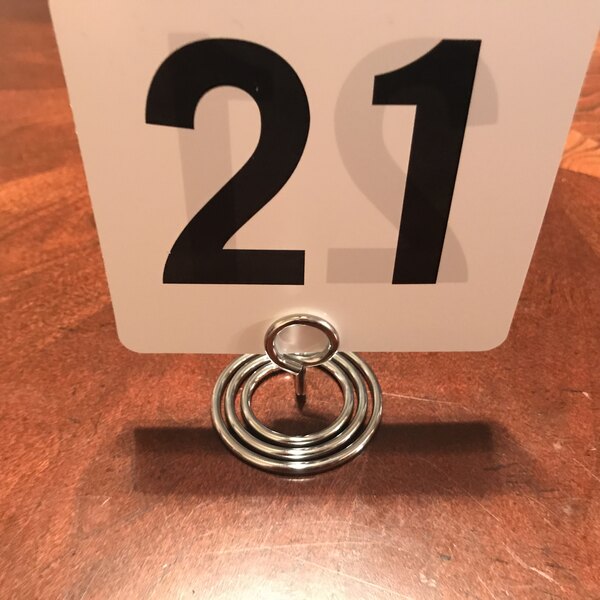 This is a great chrome card holder. It holds the card tightly between the two rings at the top. Great for drink menus or table numbers