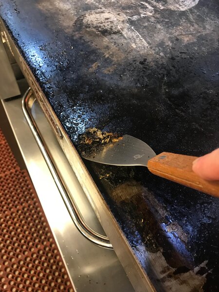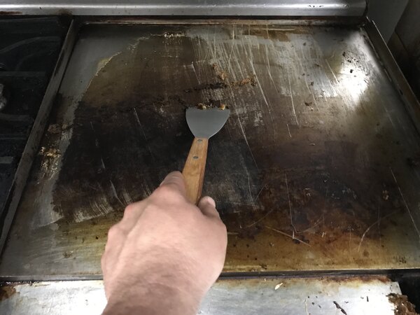 We use this slanted edge stainless steel grill scraper to scrape grit off of our griddle. I do not use this unit for directly touching food, for cleaning use only.