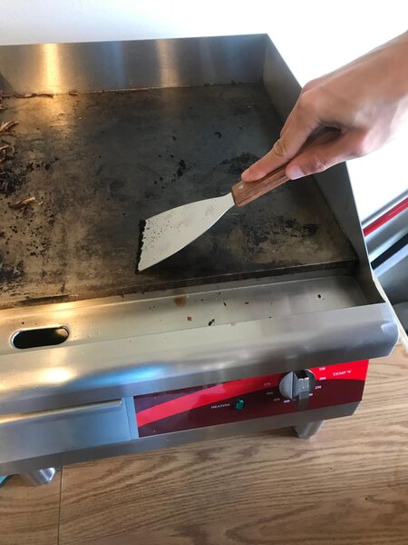 I really like the slanted edge stainless steel scraper it really gets good in the corners of the flat top to get out built up grease in that long handle really helps