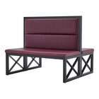 Enhance the aesthetic and functionality of your dining space with the American Tables & Seating 47 1/2" long black metal double booth with sangria vinyl. Crafted with a sturdy metal frame, this booth is built to withstand frequent use in bustling commercial environments. The modern sangria color effortlessly complements various interior styles, making it a versatile addition to your establishment. The vinyl upholstery not only provides comfort for your patrons but also ensures easy cleaning and maintenance, allowing for quick turnaround times between customers.