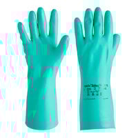 For reliable protection in a variety of applications, choose these Ansell AlphaTec® Solvex 37-165 15" green 22 mil unsupported sandpatch nitrile gloves. These gloves are made of unsupported 22 mil nitrile for optimal dexterity and comfort, while the curved finger design offers a natural fit to reduce hand fatigue. They have a smooth sandpatch finish that provides a secure grip, and they are designed for use in wet and dry work environments. These gloves are unlined with no inner cotton flocking to minimize the risk of lint contamination. Plus, they do not contain natural rubber latex, making them safe to use by wearers with Type 1 allergies.