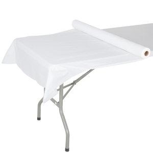 The Atlantis Plastics White Plastic Roll Table Cover-300' Roll is fantastic. It is very lightweight, very white in color, it lays nicely on the table and gives it a beautiful banquet look. The price is so incredible it's unbelievable. The clean up after the event will be a breeze because everything will be easy to gather up and throw away. It is everything I was looking for in a table cover.