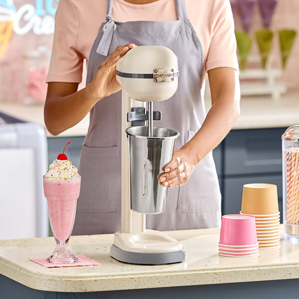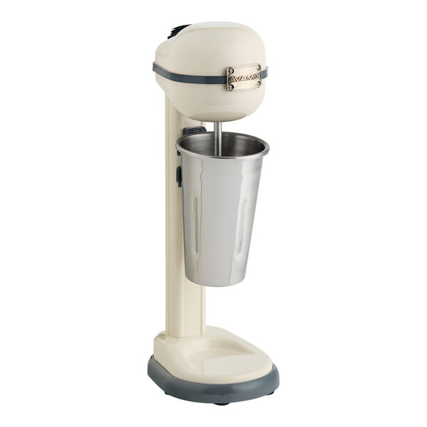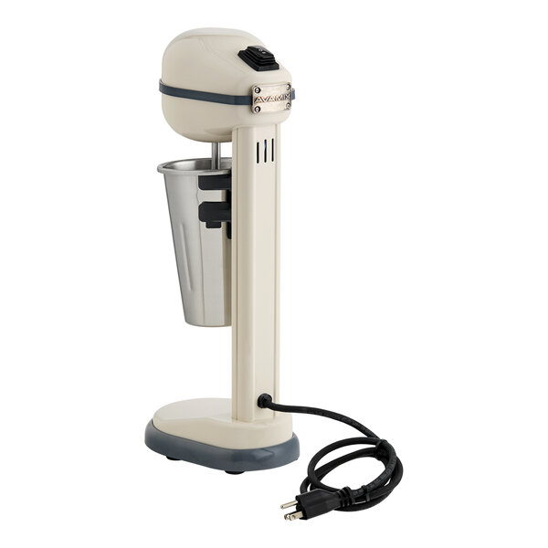 Boasting a stylish retro design with a powder-coated cream finish, this drink mixer is sure to delight your customers. It's constructed from durable steel for long-lasting performance and has a sturdy base to keep your mixer securely in place. It also features a double agitator to help you get the job done effectively and quickly. Ideal for any ice cream shop, diner, or restaurant, this drink mixer provides an easy way to grow and diversify your menu!