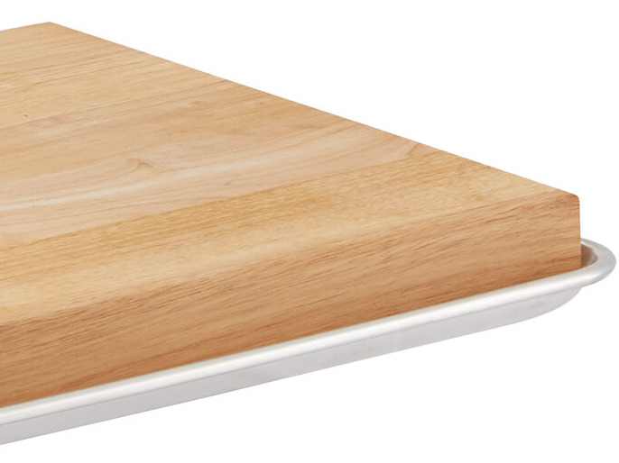 The cutting board, which is made from durable wood to resist deep scratches, is reversible for a longer service life. It is sturdy enough to be used with your biggest knives. At 24" long and 16" wide, you'll have plenty of space to work on.