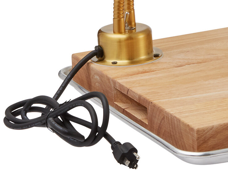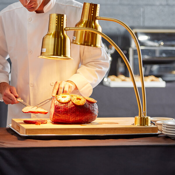 This dual-arm lamp is great for use with carving stations at hotels, banquet halls, or catered events. It gives you a range of heating options thanks to its flexible body that may be lowered toward, or raised away from foods with ease. Two separate arms allow for complete coverage! They also provide a clear view of what you're doing, which helps to ensure precise cuts when working on your delicious meats and other product.