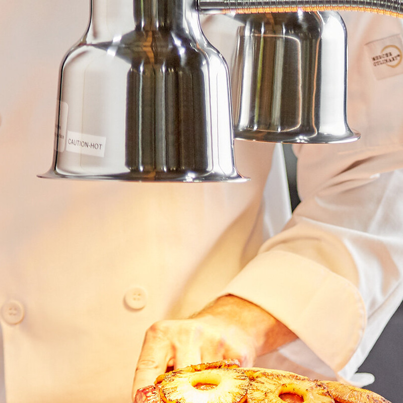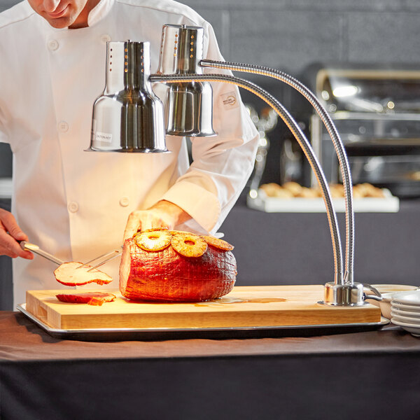This dual-arm lamp is great for use with carving stations at hotels, banquet halls, or catered events. It gives you a range of heating options thanks to its flexible body that may be lowered toward, or raised away from foods with ease. Two separate arms allow for complete coverage! They also provide a clear view of what you're doing, which helps to ensure precise cuts when working on your delicious meats and other product.