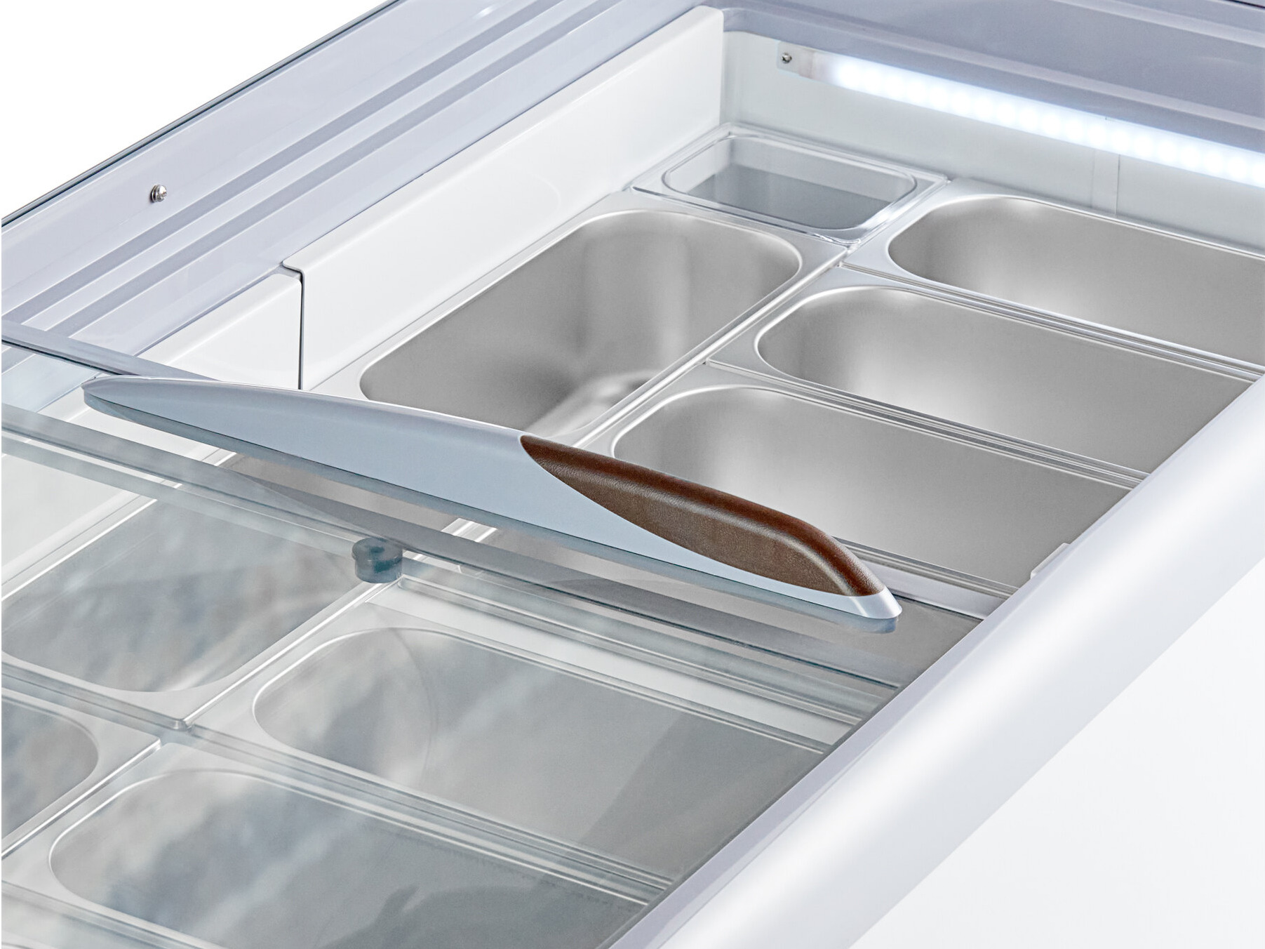 The frozen storage space beneath the display even provides a convenient place for holding back-up pans, making it a space-efficient unit for businesses with limited space.