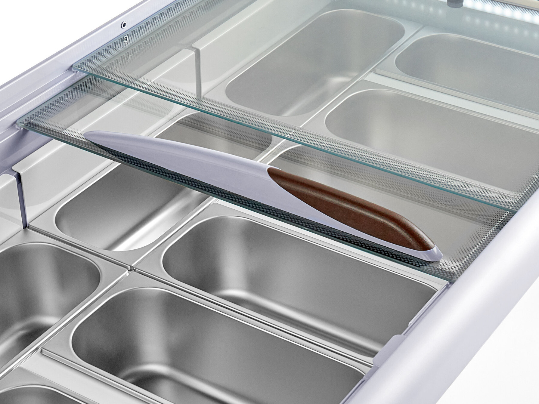 The frozen storage space beneath the display even provides a convenient place for holding back-up pans, making it a space-efficient unit for businesses with limited space.