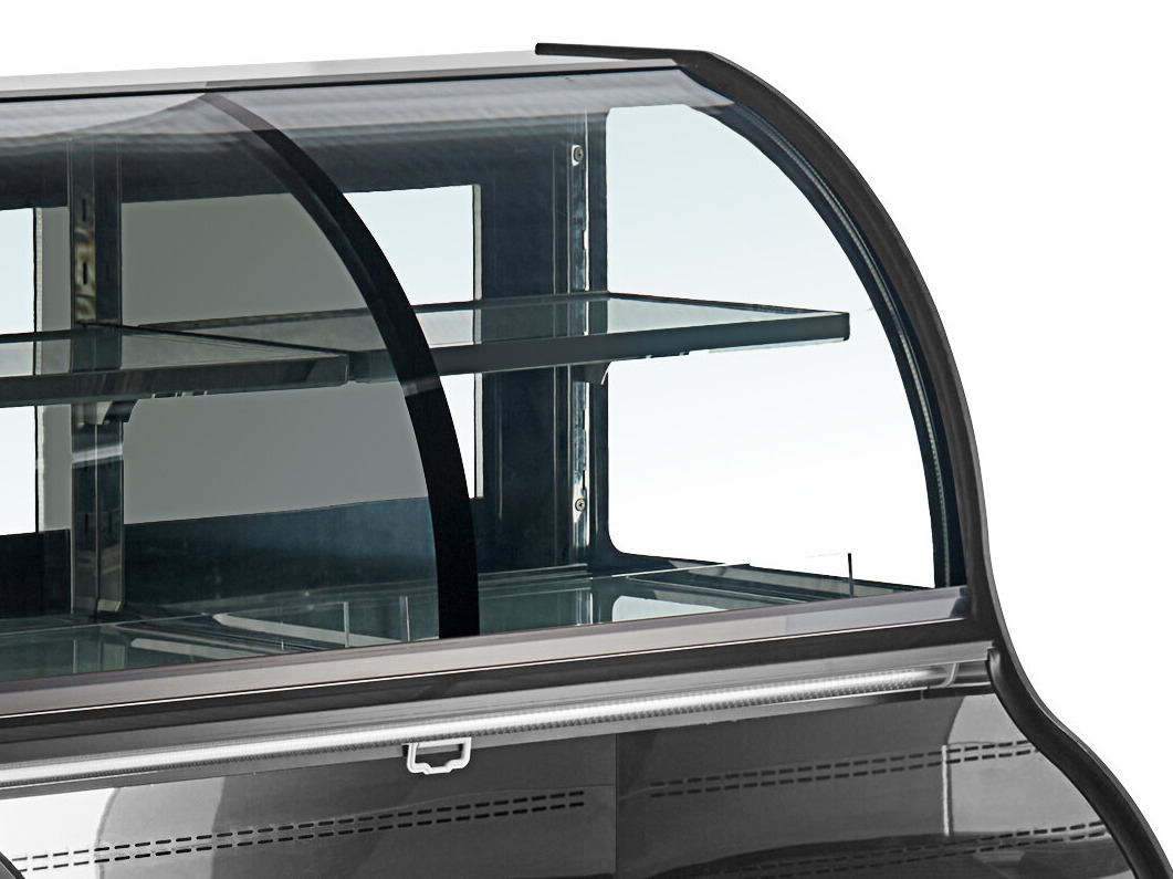 This contemporary case keeps contents sanitary while beautifully displaying them on durable glass shelves. Giving you the best of both worlds, this unit's open-air design is perfect for adding last minute upsell drinks or packaged foods to a customer's order, while the merchandiser allows for sanitary service of a variety of food items.