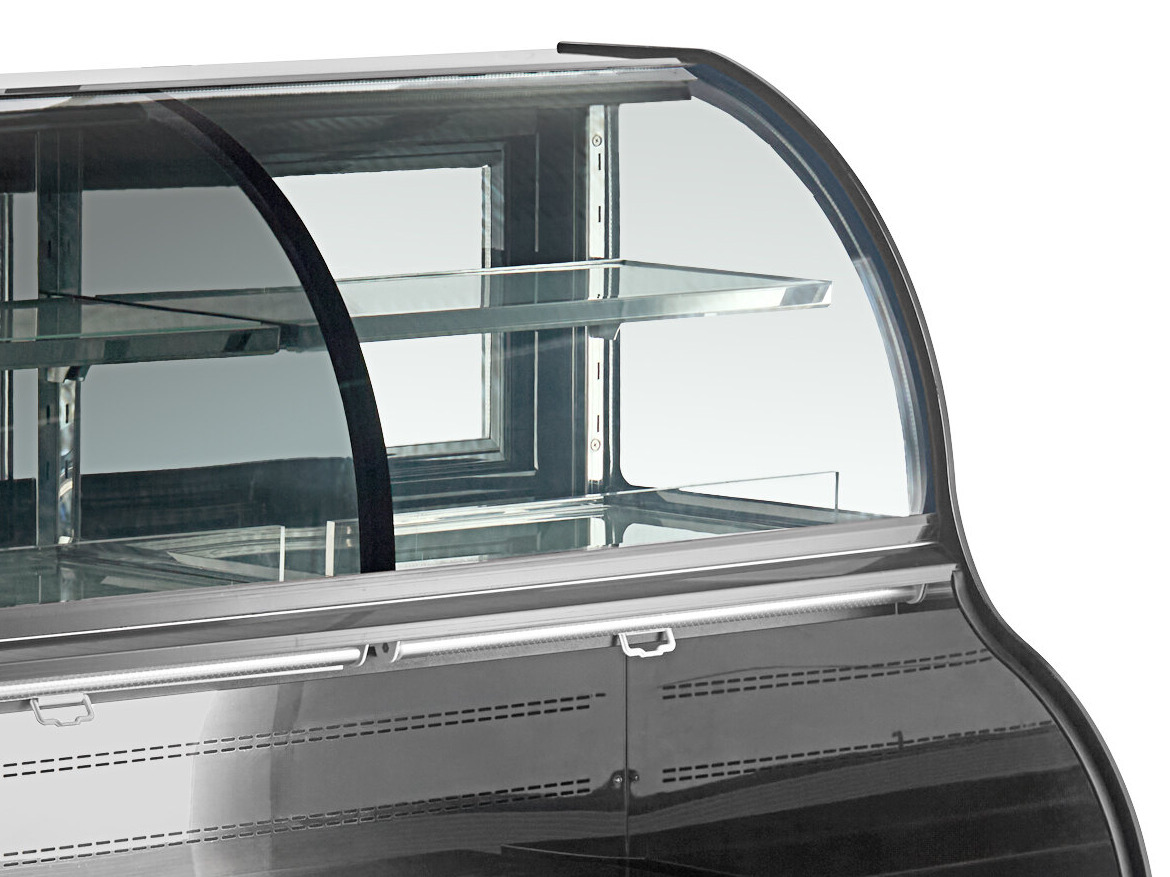 This contemporary case keeps contents sanitary while beautifully displaying them on durable glass shelves. Giving you the best of both worlds, this unit's open-air design is perfect for adding last minute upsell drinks or packaged foods to a customer's order, while the merchandiser allows for sanitary service of a variety of food items.