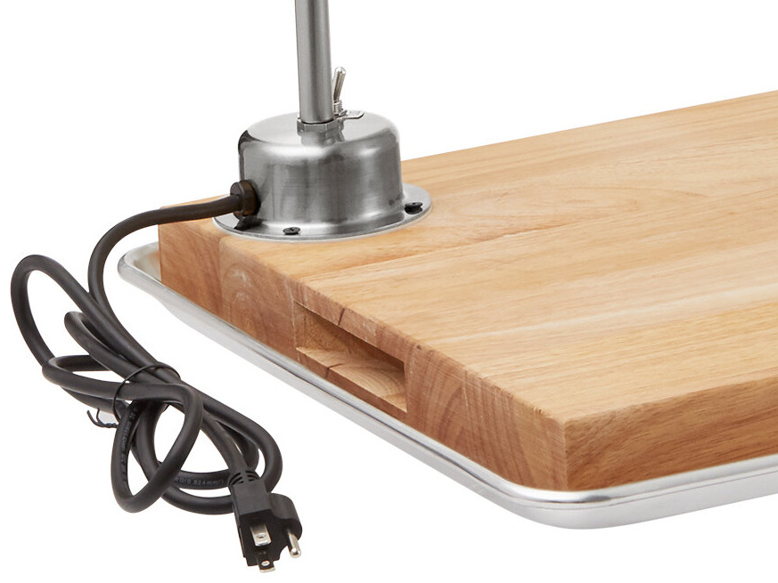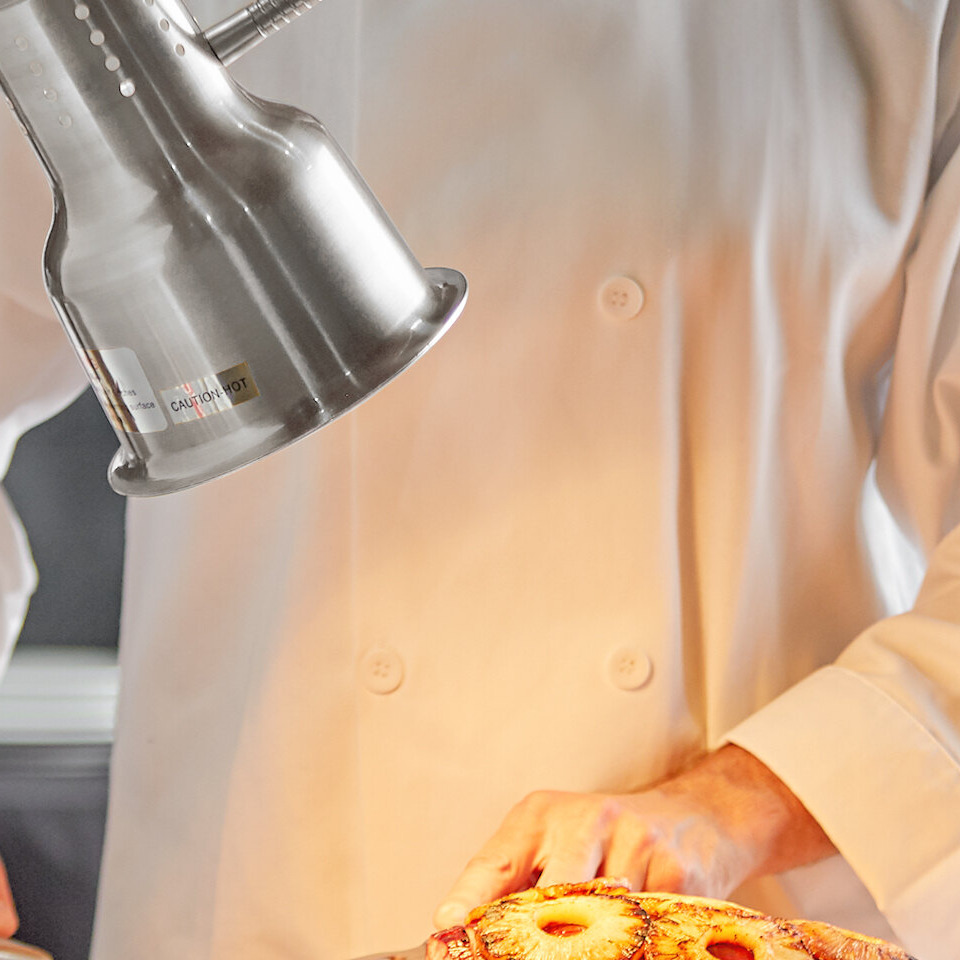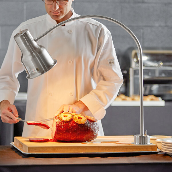This lamp is great for use with carving stations at hotels, banquet halls, or catered events. It gives you a range of heating options thanks to its flexible body that may be lowered toward, or raised away from foods with ease. It also provides a clear view of what you're doing, which helps to ensure precise cuts when working on your delicious meats and other product.