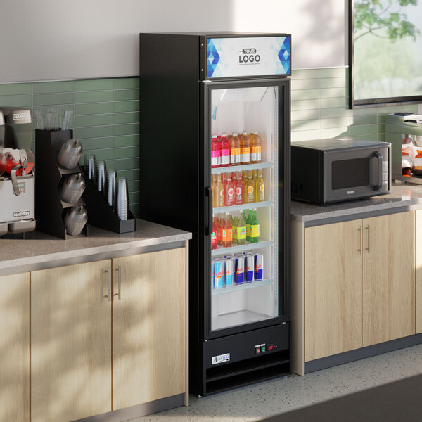 - Item #: 178gdc15bcAvantco GDC-15-HC 25 5/8" Black Swing Glass Door Merchandiser Refrigerator with LED Lighting and Customizable Panel