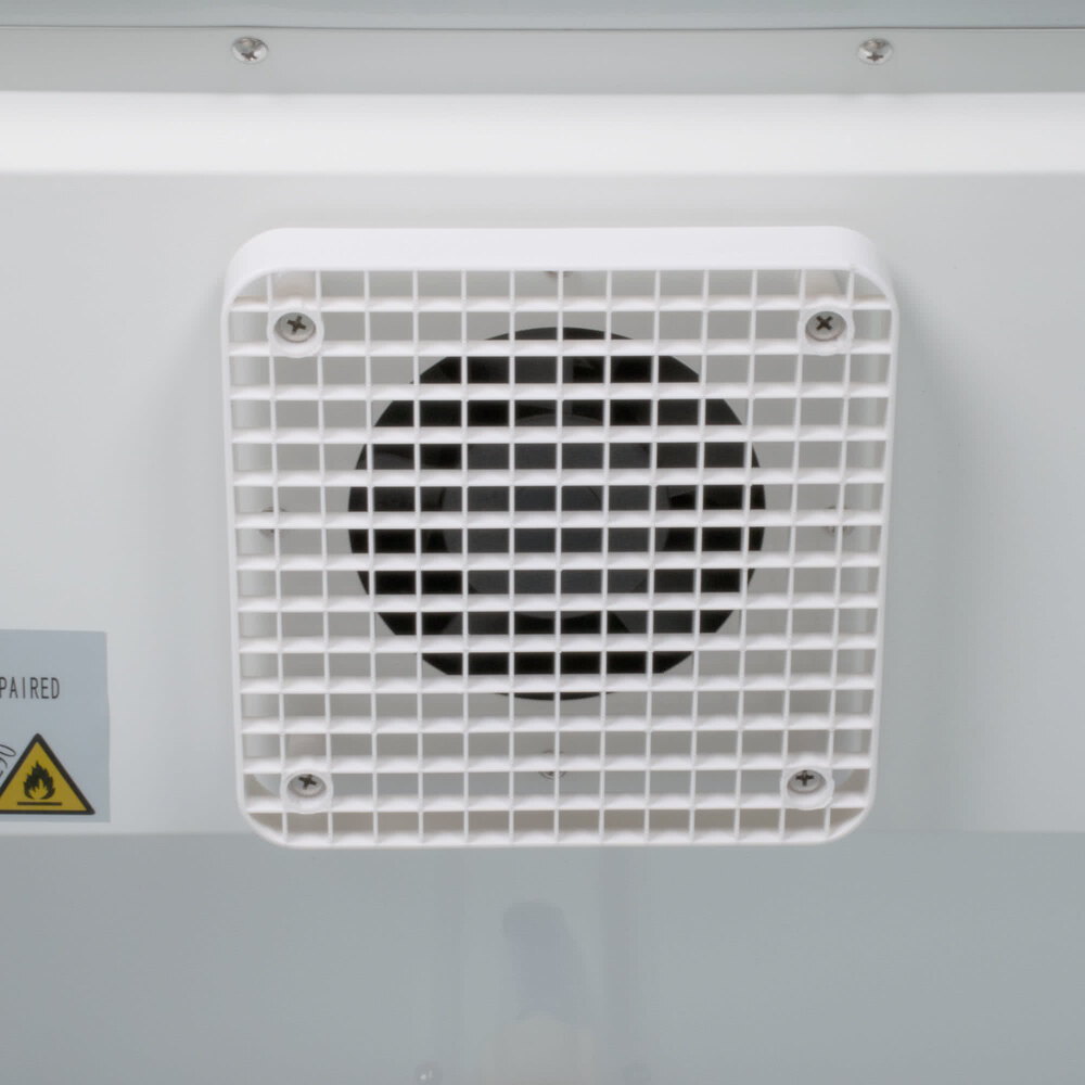 A 1/3 hp refrigeration system is located on the bottom, which draws air from the coolest part of the room for better efficiency while also increasing the height of the bottom shelf to make loading and unloading easier.