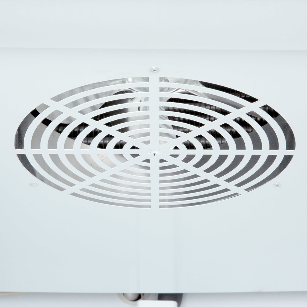 A 1 hp refrigeration system is located on the bottom, which draws air from the coolest part of the room for better efficiency while also increasing the height of the bottom shelf to make loading and unloading easier.