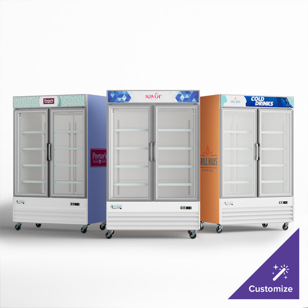 - Item #: 178gdc49fwcAvantco GDC-49F-HC 53 1/8" White Swing Glass Door Merchandiser Freezer with LED Lighting and Customizable Panel