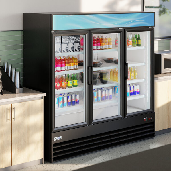 Whether you want to show off your wide selection of sodas, teas, and energy drinks, or give customers quick access to pre-packaged salads and sandwiches, this Avantco GDC-69-HC black merchandising refrigerator is the perfect unit for the task with its sharp looks and smart design features! Its three section design gives plenty of space and makes this unit great for use in applications like markets, delis, and restaurants where it can be kept in plain sight to house takeout beverages or give customers a chance to see all of the delicious desserts, sides, and drinks you offer with your meals!