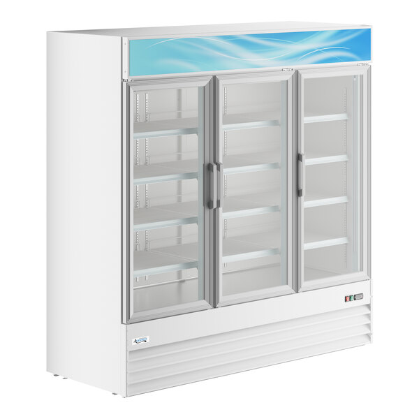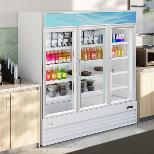 Whether you want to show off your wide selection of sodas, teas, and energy drinks, or give customers quick access to pre-packaged salads and sandwiches, this Avantco GDC-69-HC white merchandising refrigerator is the perfect unit for the task with its sharp looks and smart design features! Its three section design gives plenty of space and makes this unit great for use in applications like markets, delis, and restaurants where it can be kept in plain sight to house takeout beverages or give customers a chance to see all of the delicious desserts, sides, and drinks you offer with your meals!