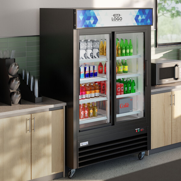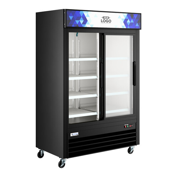 Avantco GDS-47-HC 53 1/8" Black Sliding Glass Door Merchandiser Refrigerator with LED Lighting and Customizable Panel