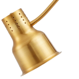 This Avantco HL39GD 39" gold single arm bulb warmer flexible heat lamp is a perfect addition to any commercial establishment. Ideal for maintaining proper food-safe temperatures, this item will keep baked goods, fried foods, and carving station meats warm while you serve them to your valued guests. Its flexible arm can also be lowered toward or raised away from your foods with ease. Plus, this heat lamp comes with a shatterproof 250W red bulb and can be mounted to a table or countertop with the Avantco PCLMPSS stainless steel clamp for heat lamps (sold separately).