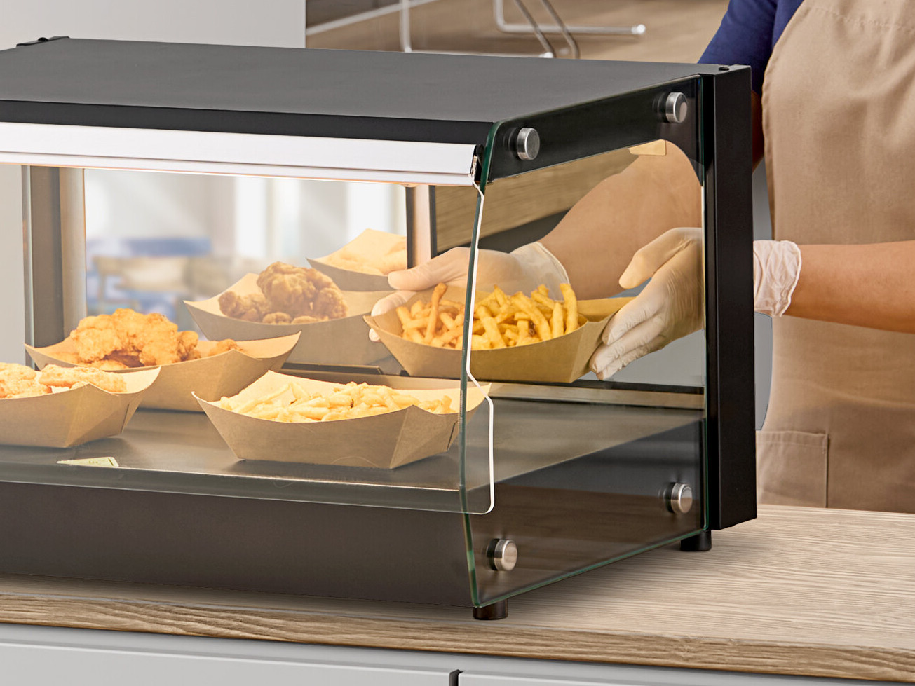 The countertop design allows for easy access to impulse sales, making it perfect for holding pre-made hot items.