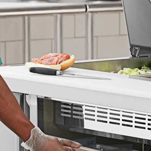 Whether used in a university, sub shop, or hospital, this counter height unit is sure to help streamline the sandwich prep process with its convenient features and capacity. This unit has a workstation, allowing users to place condiments, utensils, and even a cash register on the unit without sacrificing cutting board space!