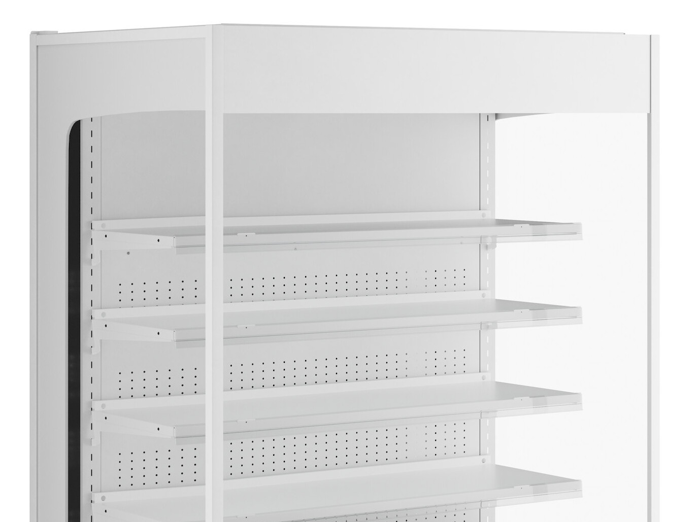 This merchandiser features bright, cool LED lighting to show off your products at their best to draw attention. For outstanding visibility and appearance, this sleek white merchandiser features glass partial sides and comes with 4 steel shelves so you can organize and load your merchandiser with confidence. Each shelf also comes ready with a price tag strip.