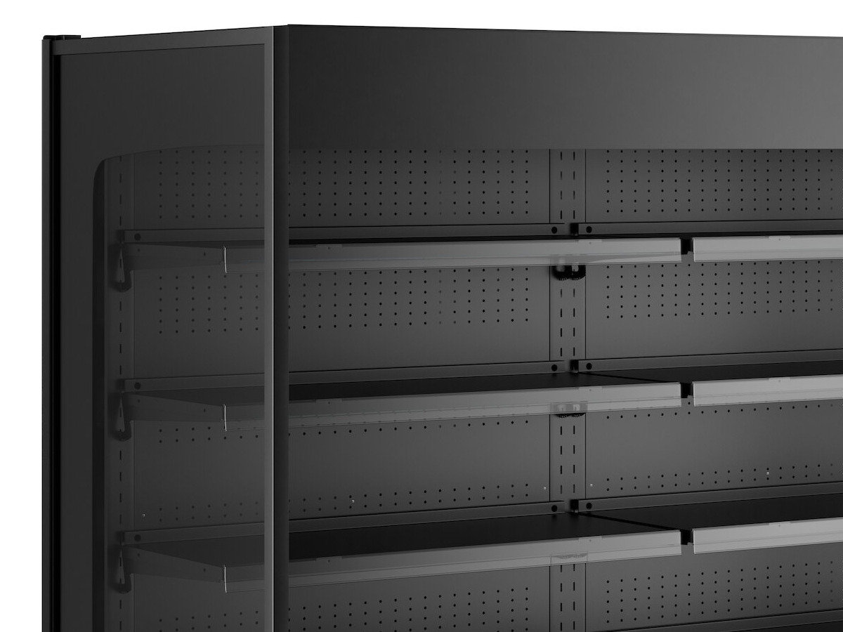 This merchandiser features bright, cool LED lighting to show off your products at their best to draw attention. For outstanding visibility and appearance, this sleek black merchandiser features glass partial sides and comes with 8 steel shelves so you can organize and load your merchandiser with confidence. Each shelf also comes ready with a price tag strip.