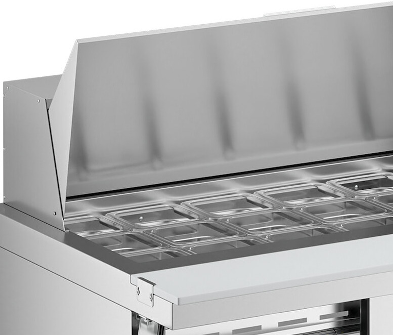 Its mega top accommodates up to (18) 1/6 size food pans up to 6" deep (included). These are great for holding common sandwich or salad toppings, from eggs and cheese to green pepper or ham. Plus, a lift-up lid encloses the top to maintain safe temperatures. The food pans are recessed into the table for better food temperature holding.