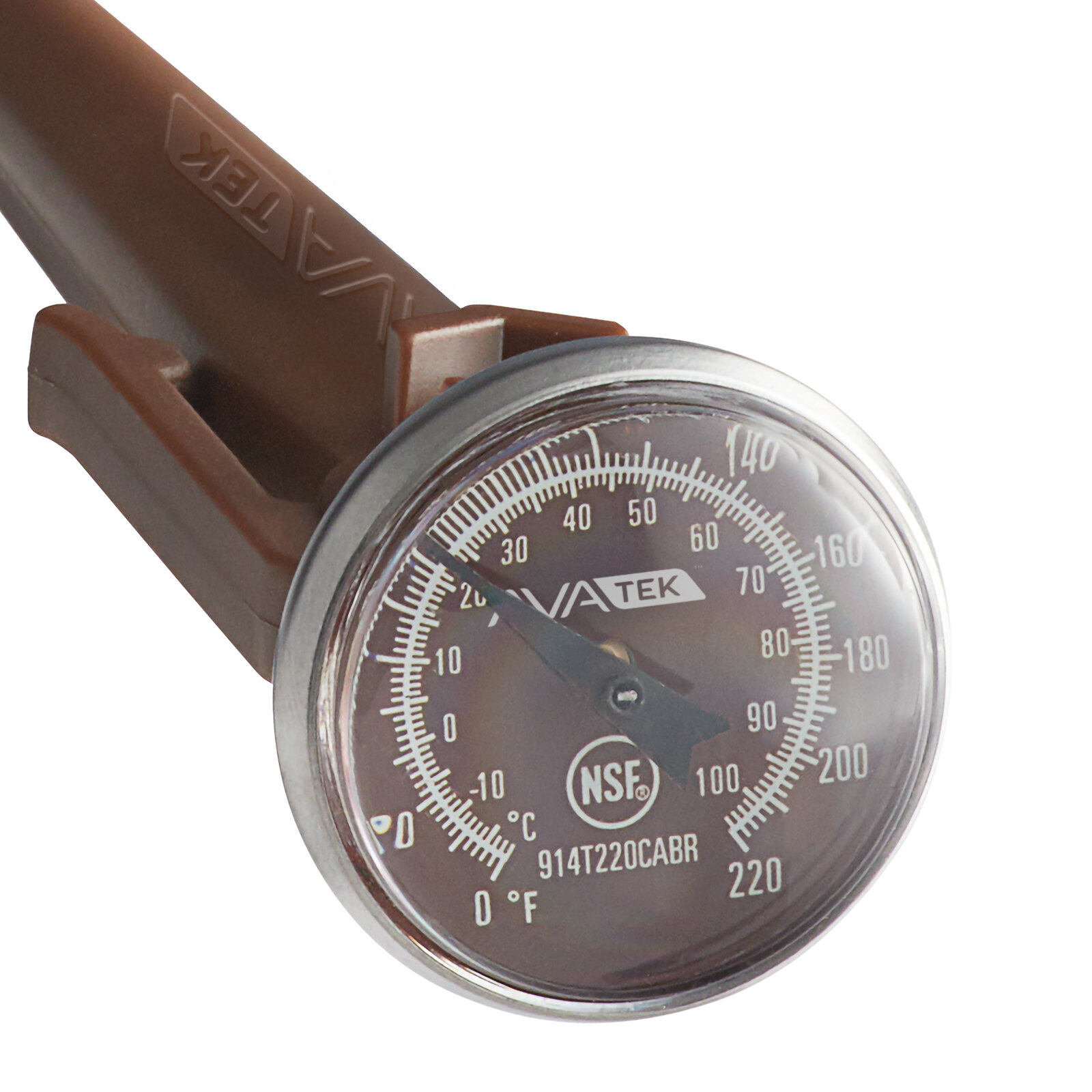 A 1" dial lets you easily read temperatures from 0 - 220 degrees Fahrenheit and -18 - 104 degrees Celsius, with +/- 2 degrees of accuracy. The lens is made from polycarbonate to provide protection from drops and impacts.