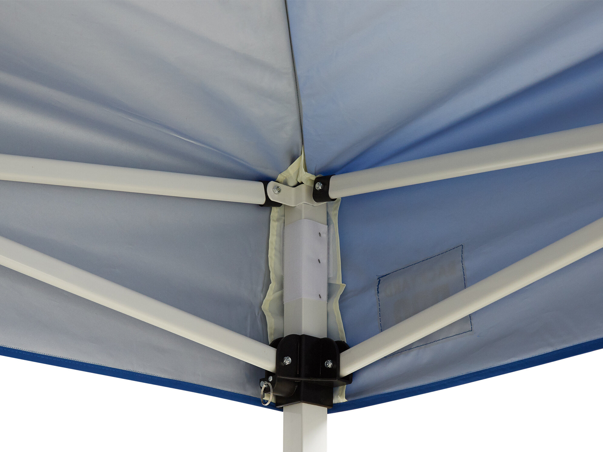 Make it easy to work your next event in style and comfort with this reliable and convenient canopy tent! It features a rising truss ceiling system that combines the benefits of the full truss system's strength with reinforced truss bars, offering additional headroom similar to a cathedral-style frame. Plus, the 4-legged design ensures stability and safety for staff and guests alike. The powder-coated steel frame and eye-catching blue canopy top combine to ensure longevity and optimum visibility, near or far.