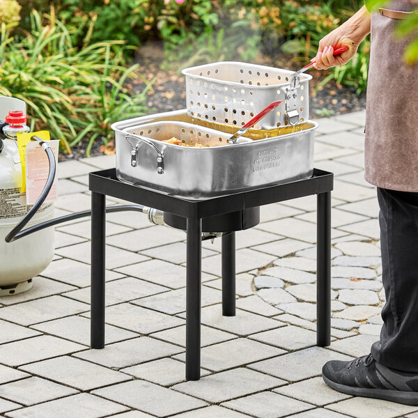 Other than the burner, the fryer also includes an 18 qt. fry pot and 2 rectangular fry baskets. All 3 pieces are made of aluminum for superior heat transfer and feature carrying handles for easy maneuvering. The basket handles are even heat-resistant to help prevent burns and keep the operator safe. Plus, for added convenience, a 5" deep fry thermometer is included. It's perfect for use when frying up small batches of specialty or limited-time-only dishes.