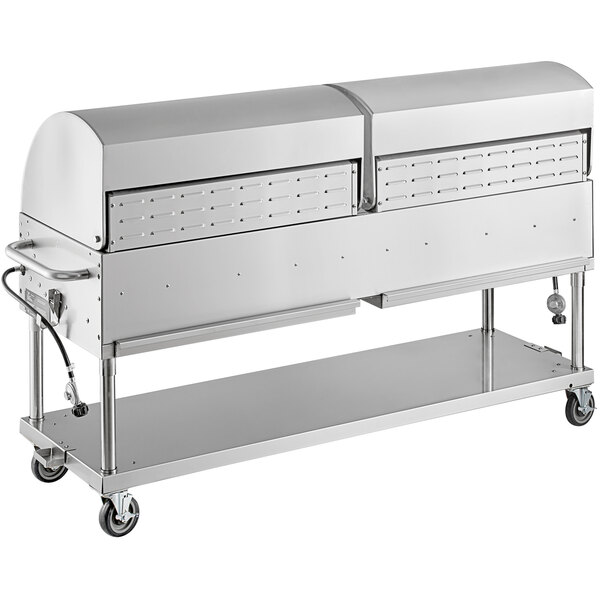 The 2 durable stainless steel roll domes keep your grill protected during any season or weather condition. The dome design ensures even cooking while still getting the beautiful sear marks that customers love. They also feature handles for easy opening and closing and built-in thermometers to keep an eye on the grill's temperature.