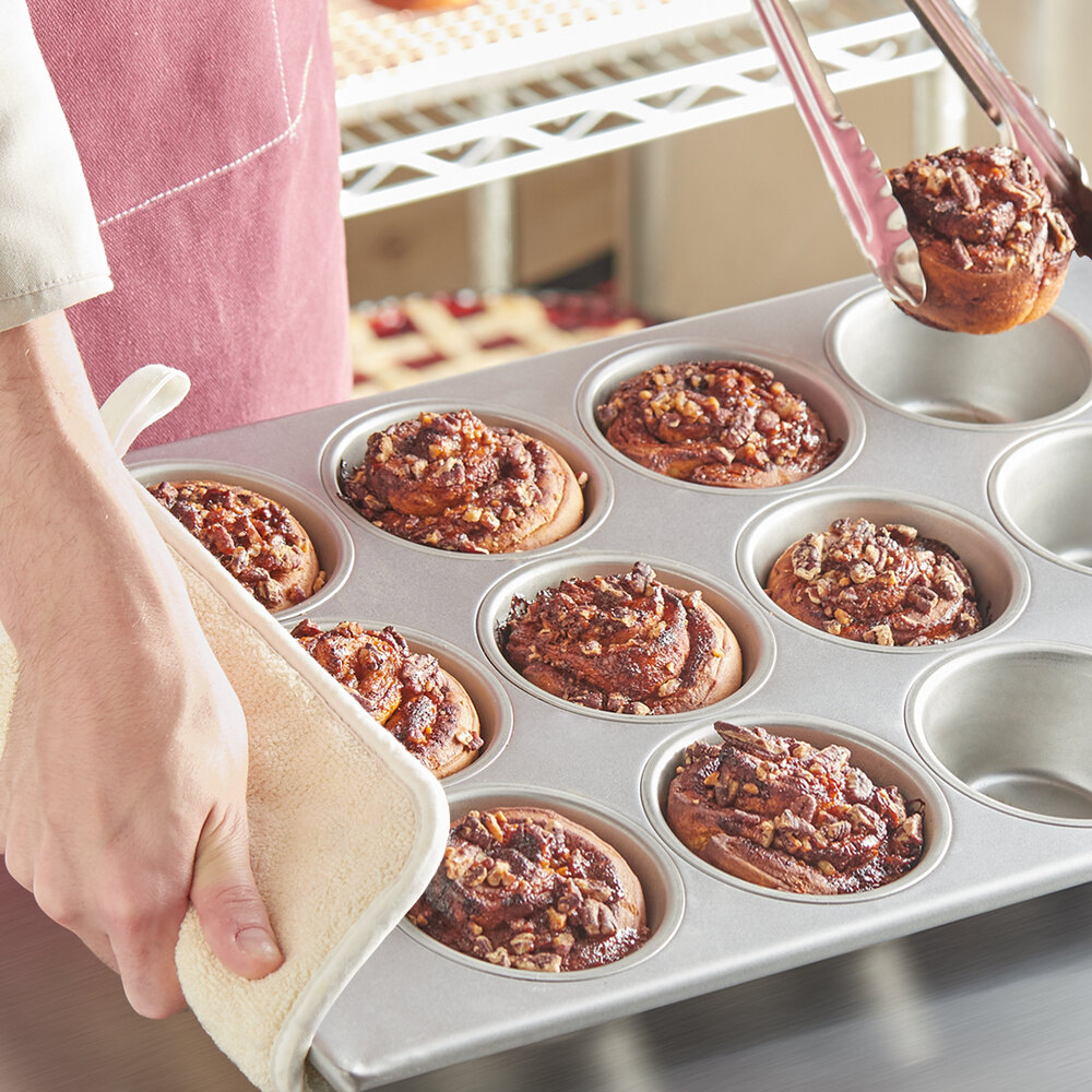 These pans are AMAZING! Heavy duty and VERY durable. I never have problems with baked batter sticking to the pans. It simply wipes off. I use this pan with the 2 1/4"X1 7/8" baking cups(#999610070) and they work PERFECT!! REMEMBER: These muffins are almost twice the size of the standard cupcake so I recommend ordering the "cake tester" (#1441445) to make sure your muffins come out perfect. Great quality at a great price! Couldn't ask for better. :)