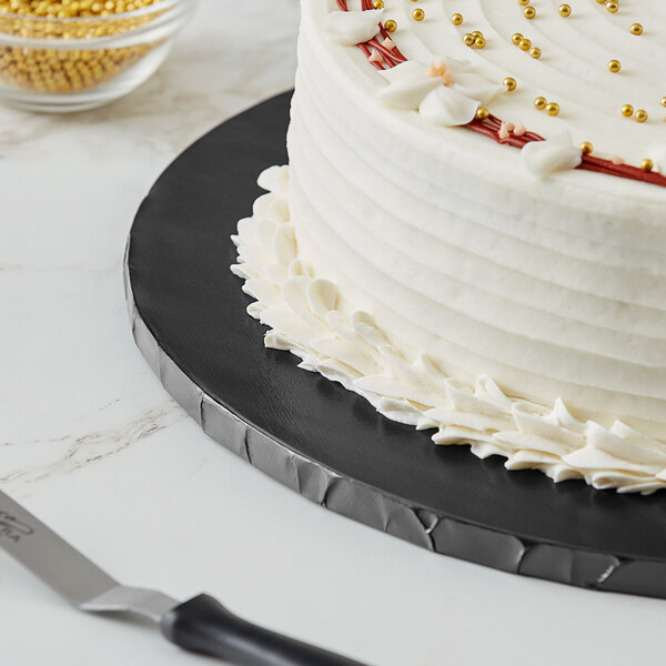 Featuring an elegant black foil-wrapped design, this cake drum adds an aesthetic touch to your dessert presentations. This makes it an ideal choice for showcasing your culinary masterpieces at any bakery, grocery store, or market.