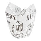 Bring delicious bakery creations to life with this Baker's Lane white newspaper print tulip baking cup. This baking cup is made with heavy weight Scandinavian paper that is grease-proof and designed to form a barrier that blocks oil transfer. This creates a more rigid baking cup that holds true and doesn't warp.