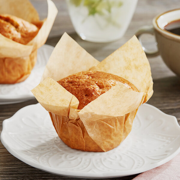 This muffin wrap features an attractive, unbleached natural kraft color and a high crown design that provides extra space and a beautiful presentation. It's ideal for baking muffins and cupcakes!