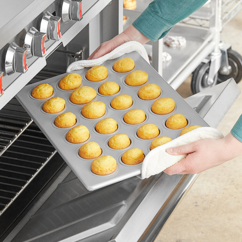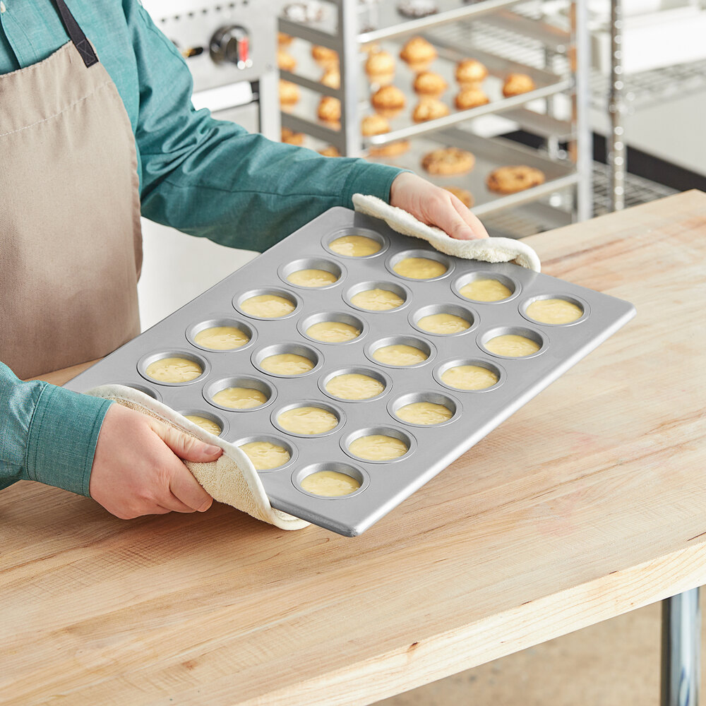 This pan is extremely sturdy and heavy, but makes the cutest little two bite mini cupcakes when combined with these White Fluted Baking Cup 1 1/2" x 1" - 1000/Pack found on this site and filled using the Vollrath 47396 #20 Yellow Squeeze Handle Disher - 1.8 oz also sold here. It bakes very evenly.